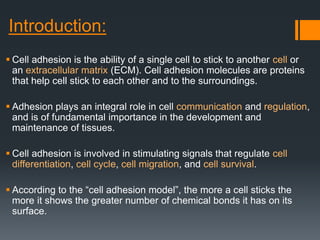 Cell adhesion molecules help cells stick to each other and their surroundings through proteins. There are several types of cell adhesion molecules including immunoglobulin super family CAMs, integrins, selectins, and cadherins. Cadherins like E-cadherin form adherens junctions between cells and link to actin through catenins. Changes in cell adhesion can lead to diseases such as cancer where reduced adhesion allows cancer cells to invade other tissues. Cell adhesion molecules are important for tissue development and function.