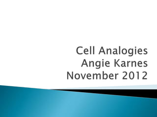 This document contains information about comparing cells to factories by analogizing different cell organelles to parts of a factory. It discusses comparing the cell wall to security gates, cell membrane to doors, nucleus to the CEO/boss, cytoplasm to the factory floor, endoplasmic reticulum to an assembly line, ribosomes to factory workers, vacuole to a kitchen, lysosomes to custodial staff, and mitochondria to a generator. Students are then asked to create their own cell analogy comparing a cell to something other than a factory, illustrate it visually, and write a 1-2 page response explaining cells, organelles, differences between plant and animal cells, and their chosen analogy.