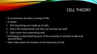 The document outlines the key discoveries in cell theory from 1665 to 1924. Some of the early discoveries include Hooke observing "cells" in cork in 1665, van Leeuwenhoek observing microorganisms in water, and Schleiden and Schwann establishing that cells are the fundamental unit of life in 1838-39. The timeline then provides more details on later discoveries such as Brown observing the cell nucleus in 1831 and developments that led to the acceptance of cell theory.
