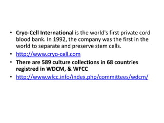 The document discusses various types of cell banks including microbial culture banks, fungal cell banks, cell banks of algae, plant culture banks, animal cell banks, and cell & tissue banks in Pakistan. Some key cell banks mentioned are Cryo-Cell International, the first private cord blood bank, the Wellcome Bacterial Collection, and the Fungal Genetics Stock Center. Cell banks store and preserve various cell types for different purposes like research and transplantation.