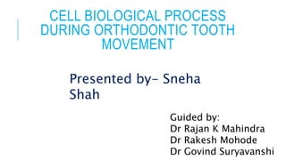The document discusses the cellular biological processes involved in orthodontic tooth movement, detailing the phases of hyalinization and bone resorption. It explains how mechanical stress impacts periodontal fibroblasts and osteoclasts, highlighting the role of various cytokines and enzymes in these processes. Additionally, the document emphasizes the interactions between different cellular precursors and the extracellular matrix during tooth movement.