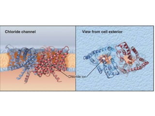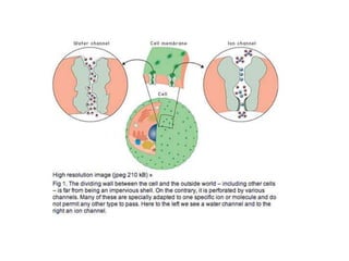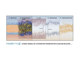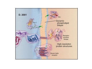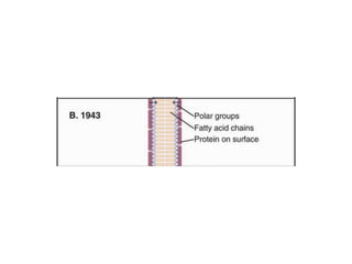 - The fluid mosaic model describes membranes as a fluid bilayer of lipids with integral proteins embedded. Key lipids include phospholipids and sphingolipids. Cholesterol provides rigidity.