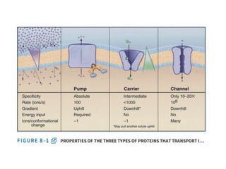 - Membranes establish gradients using pumps, carriers, and channels. Pumps actively transport ions using ATP.