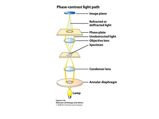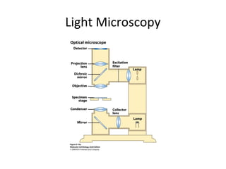 This document discusses various cell biology techniques used to visualize and study cells. It describes microscopy techniques like light microscopy, fluorescence microscopy, confocal microscopy, electron microscopy, and flow cytometry that are used to visualize cells and specific cellular structures. It also discusses techniques used to isolate and purify cellular organelles like fractionation and density gradient centrifugation. Finally, it covers cell culture methods like culturing primary cells, cell strains, and cell lines on solid growth media.