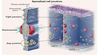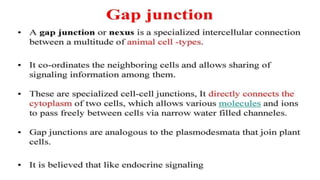 Plasmodesmata are cytoplasmic channels that connect plant cells and allow communication between them. They form during cell division around elements of the endoplasmic reticulum that become trapped in the cell wall. Plasmodesmata vary in structure and number, ranging from less than 1 to over 15 per square micrometer of cell wall. They function to transport molecules, nutrients, and signals between cells, facilitating intercellular communication and transport throughout plant tissues.