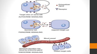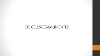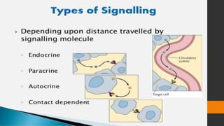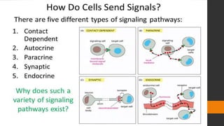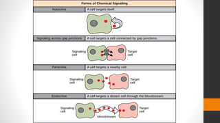 Cells communicate with each other through chemical and mechanical signals. In multicellular organisms, cell signaling allows cells to specialize and coordinate their functions from distant organs. Cells communicate through chemical messengers like hormones and neurotransmitters that act as signals between cells. Cell communication guides processes like development, homeostasis, and cell migration. There are several types of cell signaling including endocrine, paracrine, autocrine, and direct cell junctions through gap junctions and desmosomes. Contact inhibition is a process where normal cell growth stops upon contact with other cells.