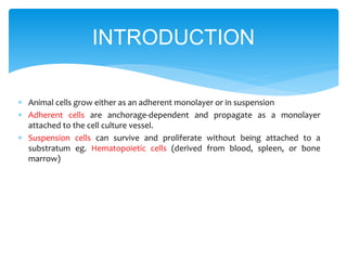 This document discusses various types of cell cultures, including primary cultures which have a limited lifespan, finite cultures which can proliferate for a limited number of divisions, and continuous cell lines which have unlimited proliferative potential. It also describes common cell culture techniques such as subculturing adherent cells using trypsin, maintaining cell viability through proper conditions, and preserving cells through cryopreservation in liquid nitrogen. Contamination is a risk that can arise from multiple sources during cell culture work.