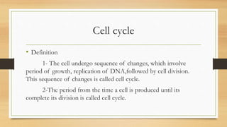 The document summarizes the cell cycle process. It discusses that the cell cycle involves a period of growth, DNA replication, and cell division. It is comprised of two main phases: interphase and mitosis. Interphase includes the G1, S, and G2 phases where the cell grows in size, DNA is replicated, and prepares for division. Mitosis is the phase where the cell undergoes division and separates the duplicated DNA between the two new daughter cells. The length of the cell cycle phases can vary depending on the type of cell.
