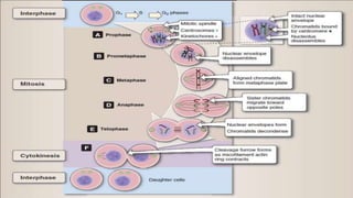 Multicellular organisms rely on cell division for growth and the replacement of lost cells, with somatic cells generated through a controlled sequence known as the cell cycle, comprising notable phases: interphase and mitotic (M) phase. Interphase involves cell growth and DNA synthesis across distinct G0, G1, S, and G2 stages, while mitosis is a rapid process divided into five phases culminating in the formation of two identical daughter cells. The document details how these processes function and regulate cellular activity, leading to proper division and the generation of new cells.