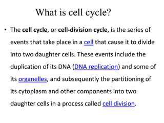 The cell cycle is a series of events that allows a cell to divide into two daughter cells, involving phases such as interphase and mitotic phase in eukaryotic cells, and distinct periods in prokaryotic cells. Interphase includes the G1, S, and G2 phases where the cell grows and replicates its DNA before mitosis, which is followed by cytokinesis to form two genetically identical cells. Additionally, some cells may enter a quiescent G0 phase where they temporarily or permanently cease to divide.