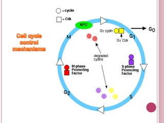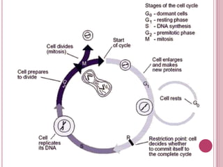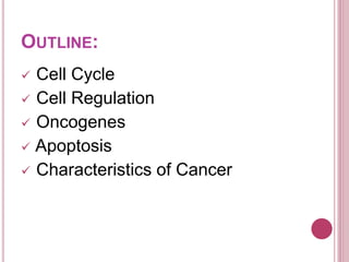 The document provides an overview of the cell cycle, including mitosis and meiosis, cell regulation, apoptosis, and the characteristics of cancer cells. It discusses mechanisms controlling cell division, such as checkpoints and factors that influence cell proliferation, including growth factors and tumor suppressor genes like p53. Additionally, it outlines the genetic basis of cancer, including proto-oncogenes, oncogenes, and mutations that can lead to uncontrolled cell growth.