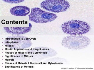 The document summarizes the processes of mitosis and meiosis in eukaryotic cells. It describes the stages of the cell cycle including interphase and mitosis. Mitosis is divided into prophase, metaphase, anaphase and telophase where chromosomes are aligned and separated. Meiosis produces gametes through two cell divisions and a single DNA replication. This reduces the chromosome number by half to maintain genetic diversity between generations. Crossing over and random chromosome segregation in meiosis lead to genetic variation important for evolution.