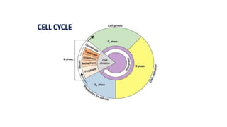 The document summarizes key aspects of the cell cycle and cell division. It begins by introducing the cell cycle, which involves the copying and distribution of a cell's genome into two daughter cells. It then describes the main phases of the cell cycle as interphase (which includes G1, S, and G2 phases) and the M phase (mitosis and cytokinesis). Interphase involves cell growth and DNA replication, while the M phase is when the cell undergoes nuclear and cellular division to form two daughter cells. In summary, the document provides an overview of the stages of the cell cycle, from interphase to mitosis and cytokinesis, and how cells grow and replicate their DNA before dividing.