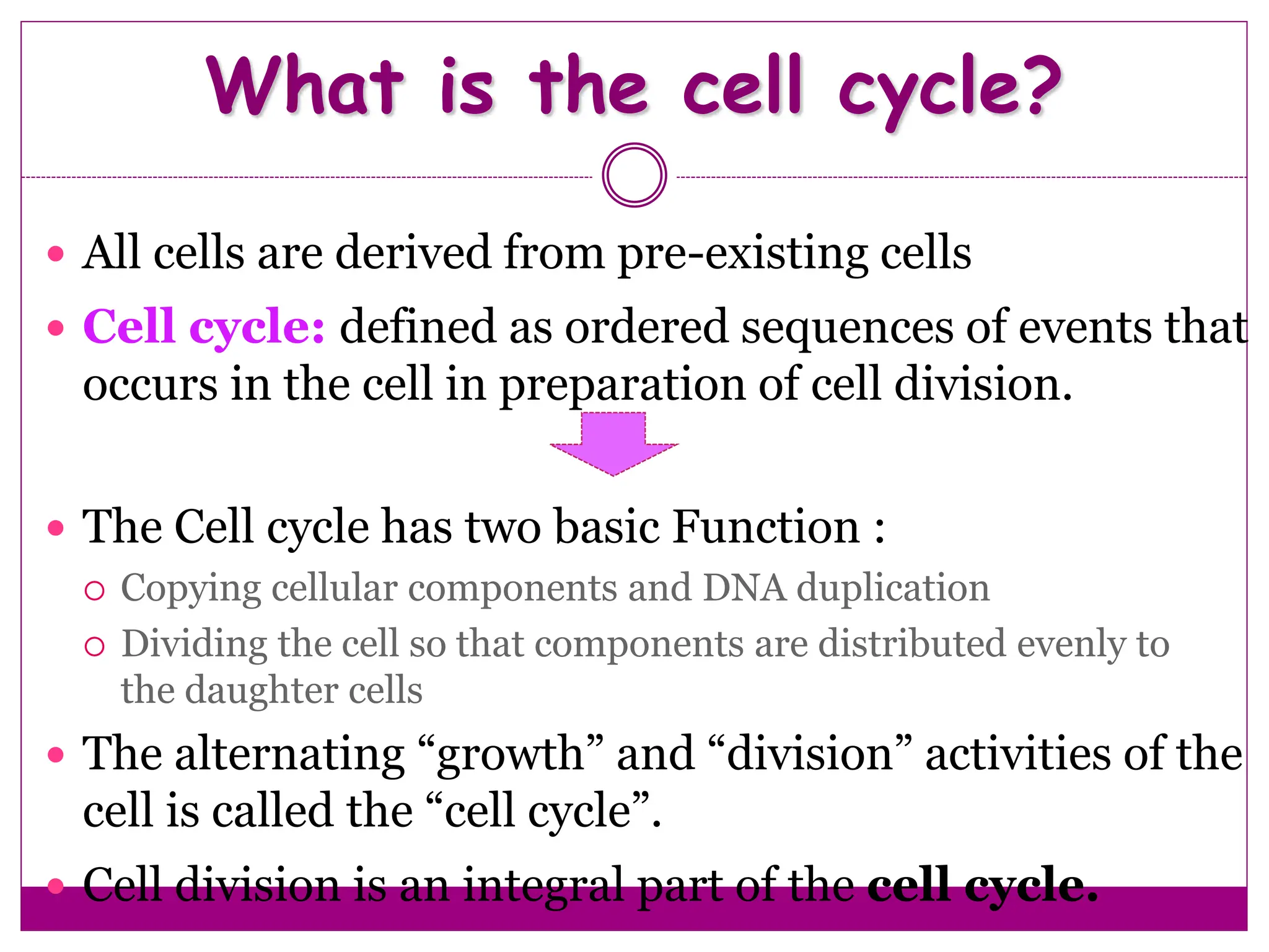 The cell cycle involves an ordered series of events that leads to cell division. It has two main functions: copying cellular components and DNA, and dividing the cell so components are distributed evenly in the daughter cells. The cell cycle consists of interphase, where the cell grows and duplicates its DNA, and M phase, where the cell divides. Interphase includes G1, S, and G2 phases, while M phase involves mitosis and cytokinesis. Checkpoints ensure the cell is ready to progress through the cycle. Deregulation of these checkpoints can lead to uncontrolled cell division and cancer.