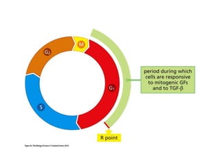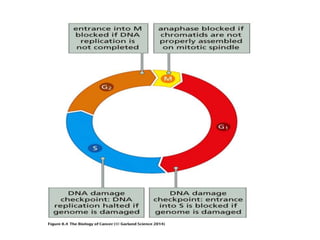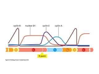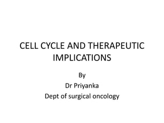 The document summarizes key aspects of the cell cycle and its implications for cancer therapy. It describes the cell cycle clock and checkpoints that regulate progression through the different phases. Dysregulation of cyclins, CDKs, and CDK inhibitors can disrupt normal cell cycle control and lead to uncontrolled proliferation. Tumor suppressor genes and oncogenes play important roles in cancer by influencing the cell cycle. Chemotherapy and radiation therapy target rapidly dividing cancer cells, aiming to push them through checkpoints where they are most vulnerable. CDK4 inhibitors show promise for breast cancer treatment by decreasing the proliferation marker Ki67.