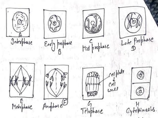 The document summarizes the process of cell division and the cell cycle. It explains that cell division allows for the reproduction of cells and the formation of daughter cells from a mother cell. The cell cycle consists of interphase, which includes the G1, S, and G2 phases for cell growth and DNA replication, and the mitotic phase of prophase, metaphase, anaphase and telophase for nuclear division. Mitosis is important for normal growth, development, and repair of living organisms through the formation of new tissues and replacement of old cells.