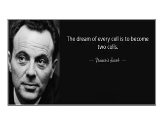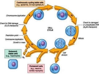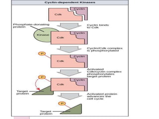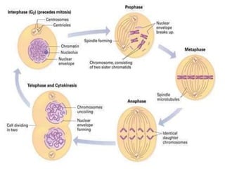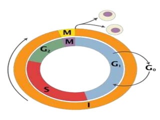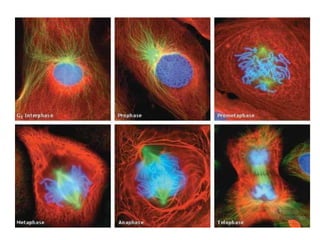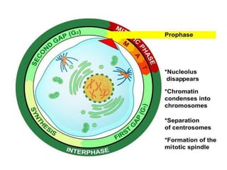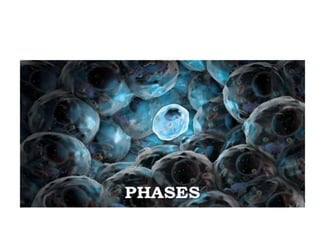 The document discusses the cell cycle and its phases. It begins with an introduction to the cell cycle and its importance in cell division and organism development. It then summarizes the main phases of the cell cycle in eukaryotic cells: interphase consisting of G1, S, and G2 phases and the mitotic phase consisting of prophase, metaphase, anaphase, telophase, and cytokinesis. Checkpoints ensure proper cell division and growth is regulated by cyclins and cyclin-dependent kinases.