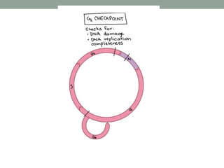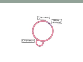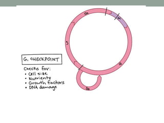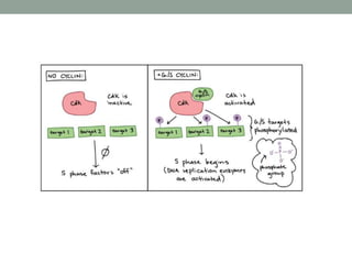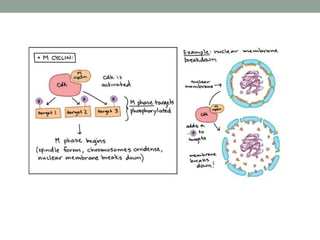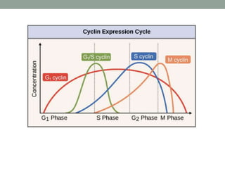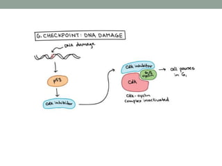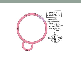 The document summarizes key aspects of cell cycle regulation, including checkpoints and core regulatory proteins. It discusses three important checkpoints - the G1, G2, and spindle checkpoints - and how they ensure DNA integrity before progression. It then explains that core regulators like cyclins, cyclin-dependent kinases (Cdks), and the anaphase promoting complex (APC/C) drive the cell cycle in response to internal and external cues by activating or deactivating target proteins through phosphorylation or ubiquitination.