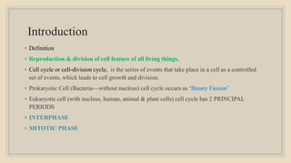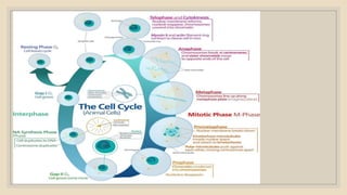 Cell cycle and DNA repair are essential processes in living cells. The cell cycle consists of interphase and the mitotic phase, and includes four main phases: G1, S, G2, and M phase. DNA is replicated in S phase and the cell divides in M phase. There are also checkpoint controls between phases to ensure DNA is properly replicated and repaired before the cell divides. DNA can become damaged through normal cellular processes, radiation, hydrolysis, oxidation and other environmental factors. Cells have several DNA repair mechanisms, including excision repair, photo reactivation, and mismatch repair to identify and correct DNA damage and prevent mutations. Unrepaired DNA damage can lead to diseases like xeroderma pigmentosum and at