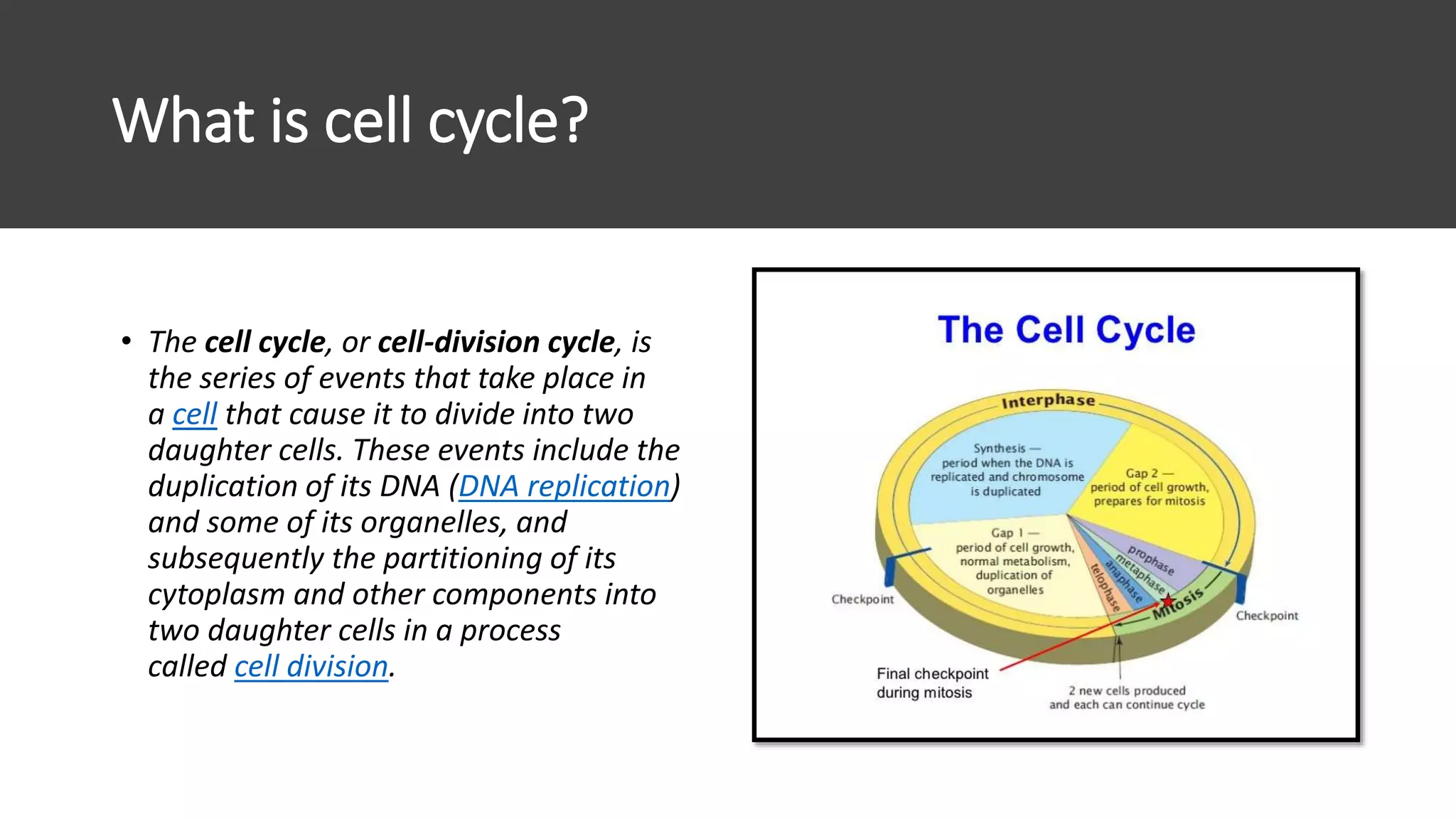 The cell cycle is the series of events that cause a cell to divide into two daughter cells. It includes DNA replication, organelle duplication, and cell division. The cell cycle consists of interphase and the M phase. Interphase includes the G1, S, and G2 phases where the cell grows and duplicates its DNA. The M phase is mitosis where the cell divides into two identical daughter cells followed by cytokinesis where the cell cytoplasm is partitioned. Mitosis consists of prophase, metaphase, anaphase and telophase where the chromosomes align and separate. The document provides details on each phase of the cell cycle.