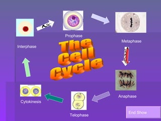 The document describes the stages of the cell cycle, including interphase where the cell grows and chromosomes are copied, prophase where the nuclear envelope breaks down, metaphase where chromosomes line up in the center, anaphase where chromosomes are pulled to opposite poles, telophase where new nuclei form, and cytokinesis where the cell membrane pinches to form two daughter cells.