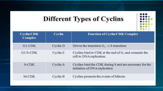 The presentation discusses the cell cycle, detailing its phases (G1, S, G2, and M) and the importance of regulation to ensure proper cell division and prevent issues like cancer. It highlights key regulatory mechanisms, including checkpoints and the role of cyclin-dependent kinases (CDKs) and cyclins in facilitating the cell cycle progression. The document also acknowledges the contributions of notable researchers in the understanding of cell cycle regulation.