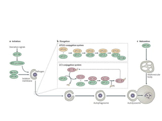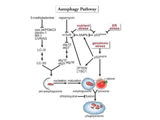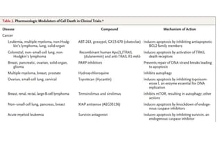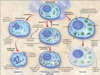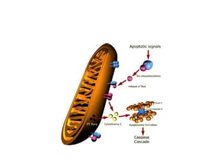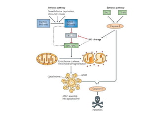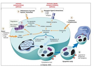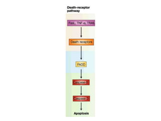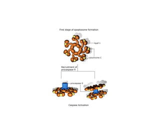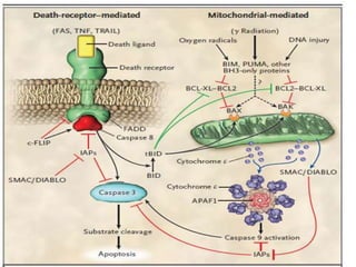 Apoptosis is a genetically programmed form of cell death that is essential for sculpting body structures during development, removing excess or harmful cells, and serving immune system functions. Key morphological changes during apoptosis include membrane blebbing, chromatin condensation, cytoplasmic condensation, DNA fragmentation, and the cell being phagocytosed. Signaling pathways such as TNF, Fas, and TRAIL induce apoptosis through caspase activation and regulation by pro-apoptotic and anti-apoptotic Bcl-2 family members. Apoptosis is important in many clinical contexts like cancer, autoimmune disease, and neurodegeneration.