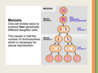 The document explains cell division, emphasizing mitosis and meiosis as essential processes in reproduction and growth. Mitosis is a part of the cell cycle that results in two identical daughter cells, while meiosis creates gametes with half the chromosome number. The stages of mitosis (prophase, metaphase, anaphase, telophase, and cytokinesis) are detailed alongside the role of DNA in protein synthesis.