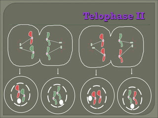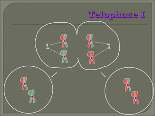 Meiosis is the type of cell division that produces gametes, such as sperm and egg cells, which have half the number of chromosomes as regular body cells. It involves two cell divisions - Meiosis I and Meiosis II. In Meiosis I, homologous chromosomes pair up and separate, reducing the chromosome number by half. Meiosis II then separates the sister chromatids, resulting in four haploid daughter cells each with a single set of chromosomes. Meiosis introduces genetic variation through independent assortment of chromosomes and crossing over, providing the raw material for natural selection.