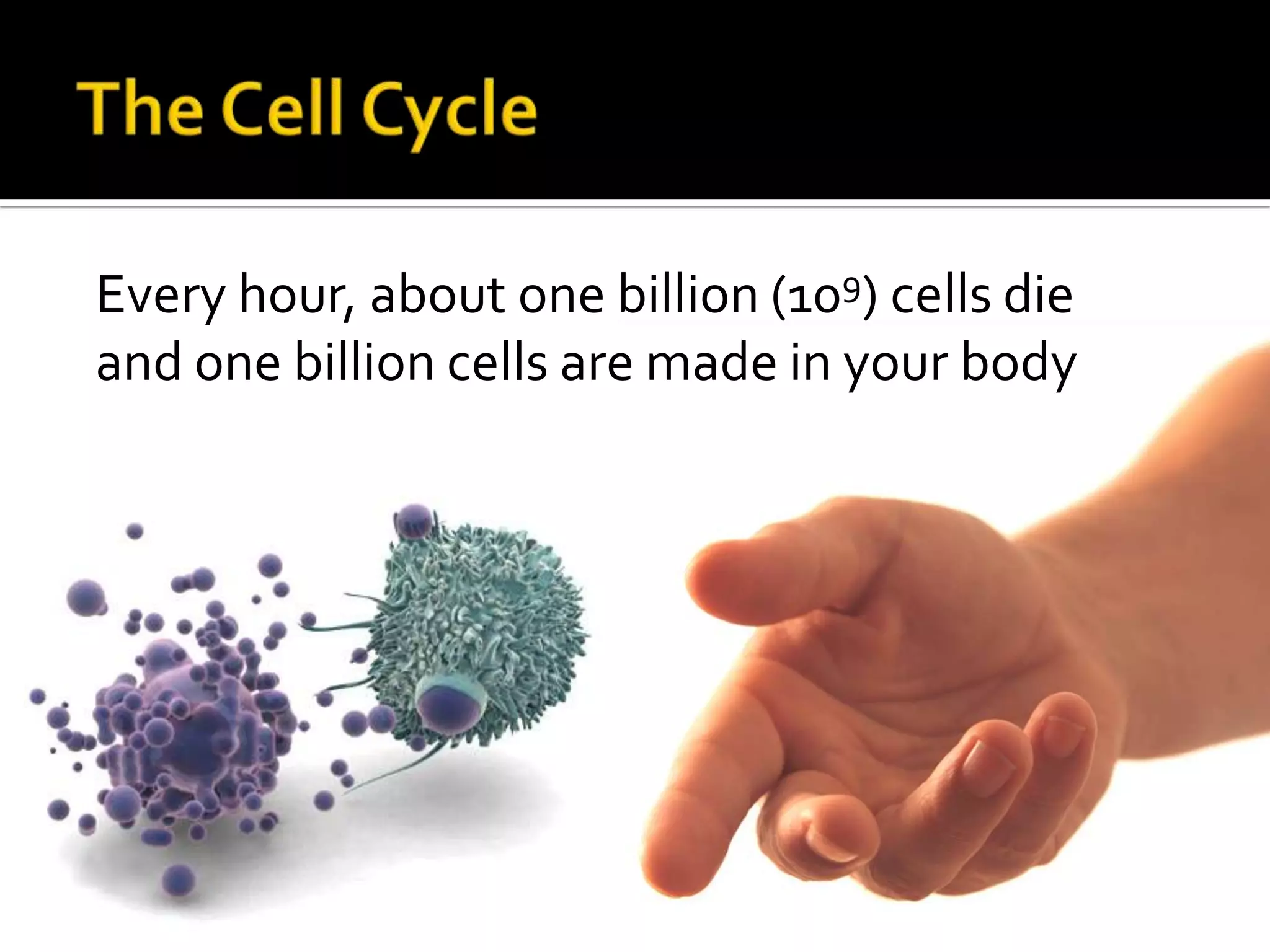 The cell cycle is the repeating series of growth and division that produces new cells. It consists of interphase, where the cell grows and DNA is replicated, and mitosis, where the cell divides into two daughter cells each with identical DNA. Chromosomes, made of DNA and proteins, condense during cell division and separate into each new cell, ensuring genetic continuity. The cycle controls cell growth, division, and death through regulated phases.