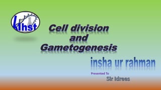 Cell division is the process by which cells duplicate their DNA and divide to produce two daughter cells. There are two main types of cell division: mitosis, which produces identical daughter cells, and meiosis, which reduces the chromosome count to produce gametes. The cell cycle consists of interphase, where the cell grows and duplicates its DNA, and the mitotic phase where the cell divides. Mitosis involves prophase, prometaphase, metaphase, anaphase, telophase, and cytokinesis to split the cell. Meiosis occurs in germ cells and involves two cell divisions to reduce the chromosome count from diploid to haploid. Spermatogenesis and oogenesis are the processes by which male and