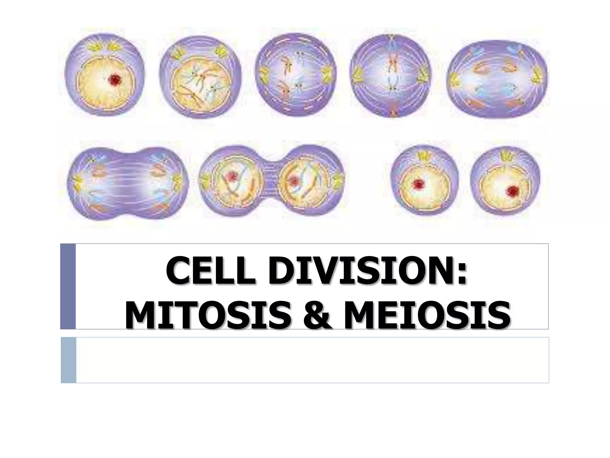Mitosis and meiosis are two types of cell division. Mitosis produces identical body cells for growth and repair through somatic cell division. Meiosis produces gametes like sperm and egg through gamete cell division, reducing the chromosome number by half to allow fertilization. Both processes involve nuclear division and cytokinesis, but differ in the number of divisions and ploidy level of the resulting cells.