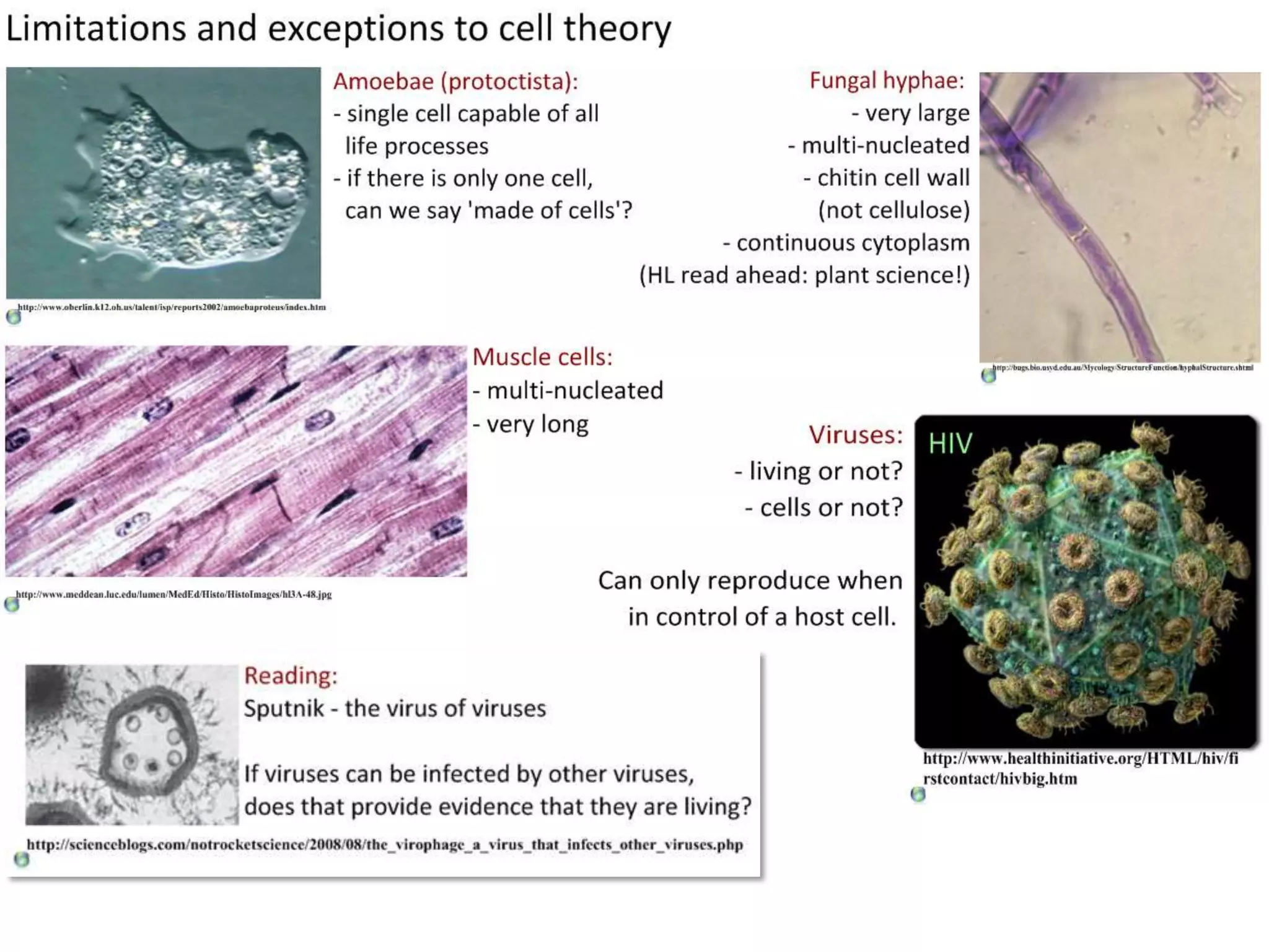 Cells come in different shapes, sizes, and specialized structures depending on their function. There are two main types of cells - prokaryotic cells which lack nuclei and organelles, like bacteria, and eukaryotic cells which contain nuclei and membrane-bound organelles, like plant, animal, fungi and algae cells. While most cells contain hereditary information that is passed from parent to daughter cells, viruses lack cellular structures and can only reproduce using a host cell.
