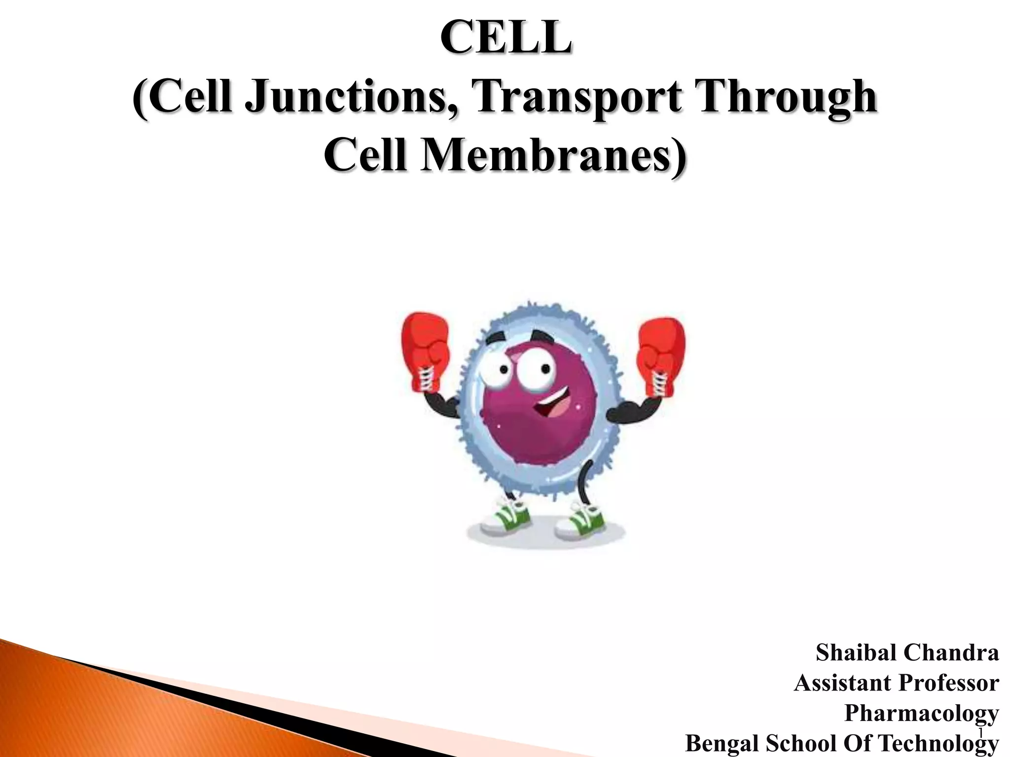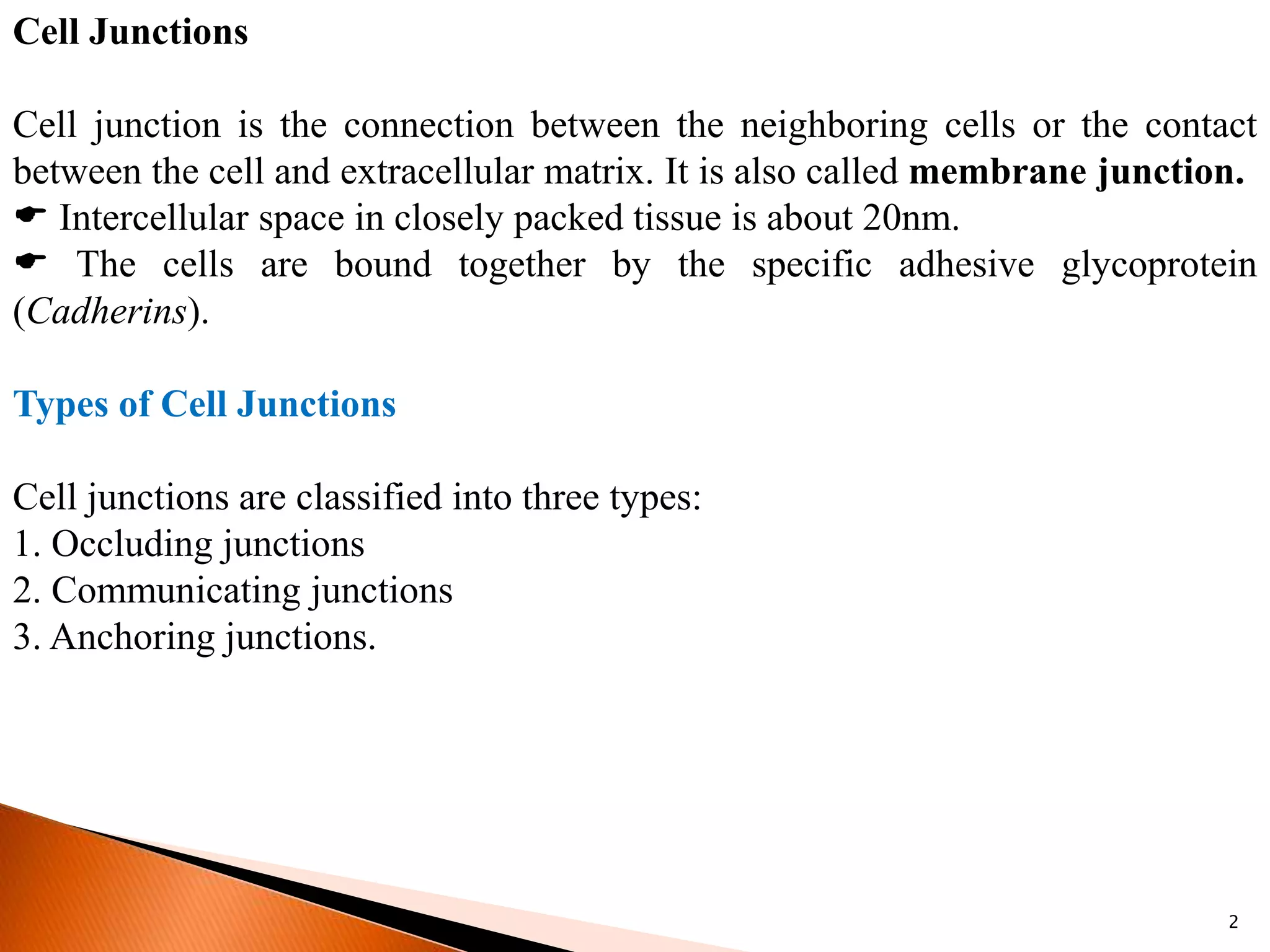 This document summarizes cell junctions, transport through cell membranes, and cell adhesion molecules. It discusses three main types of cell junctions - occluding junctions, communicating junctions, and anchoring junctions. It then describes various transport mechanisms like passive transport (simple diffusion, facilitated diffusion) and active transport. Finally, it discusses four main types of cell adhesion molecules - cadherins, integrins, IgG superfamily, and selectins.