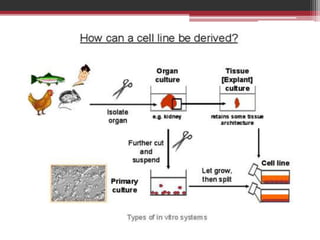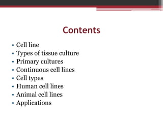 Cell lines are permanently established cell cultures that can proliferate indefinitely. They are derived from primary cell cultures which have a finite lifespan. Continuous cell lines have undergone transformation to proliferate indefinitely, unlike finite primary cultures. Common types of cell lines include normal and transformed cell lines of epithelial, fibroblast, or lymphoblast morphology derived from human or animal tissues. Primary cultures are used to establish cell lines which are then used for applications like drug screening, toxicity testing, and cancer research.