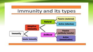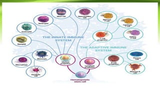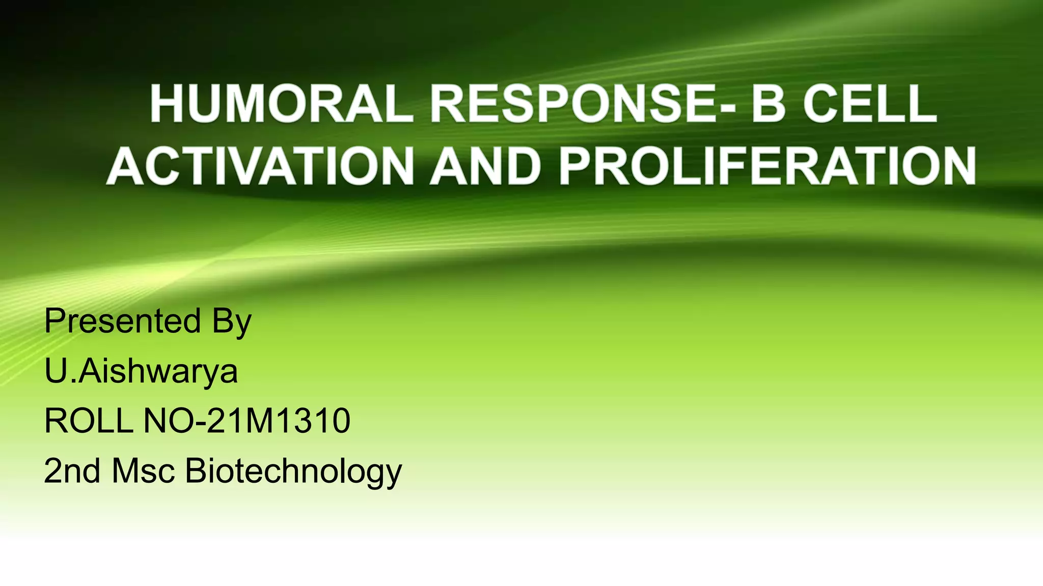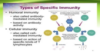 This document provides an overview of the immune system and immunology. It discusses the immune response, functions of the immune system, types of immune cells, acquired immunity, humoral responses, B-cell activation and proliferation. The key points are: immunology studies the immune system and its response to protect the body from pathogens; the immune system recognizes foreign substances and acts to neutralize or destroy them; acquired immunity creates immunological memory to enhance response to subsequent exposures. B-cells play a major role in the humoral immune response by differentiating into plasma cells that secrete antibodies specific to antigens.