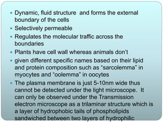 The document discusses cell membranes and summarizes several theories of their structure and function. It begins by describing the basic properties and components of cell membranes. It then summarizes key theories and models of membrane structure proposed by Overton, Langmuir, Gorter and Grendel, Danielli and Davson, Robertson, and Singer and Nicolson. Their fluid mosaic model from 1972 proposed that membranes are a fluid bilayer of lipids with integral and peripheral proteins dispersed within.