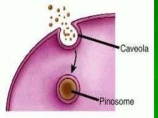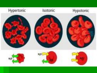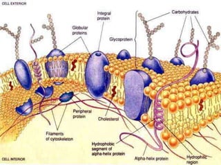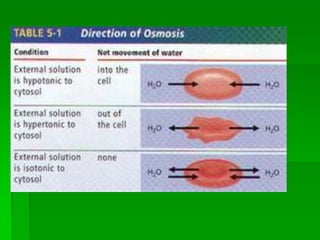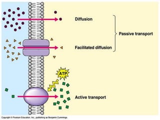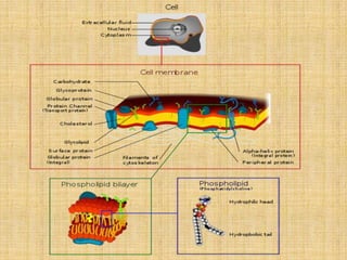 This document discusses cell boundaries and membrane transport. It begins by defining cell boundaries as the cell membrane and cell wall. The cell membrane is a thin, flexible barrier that regulates what moves in and out of the cell through passive and active transport. The cell wall provides additional structure and protection for some cell types. The cell membrane is made of a phospholipid bilayer with embedded proteins. Materials move across the membrane through diffusion, osmosis, and protein-mediated transport processes. Osmosis allows water to move across the membrane down its concentration gradient. Active transport requires energy and pumps molecules against their concentration gradient with protein transporters. Cells maintain equilibrium through these passive and active transport mechanisms.