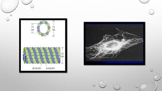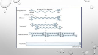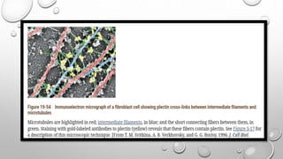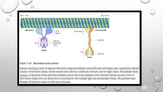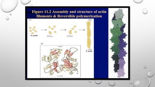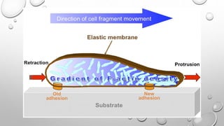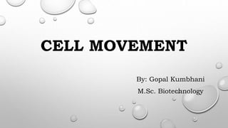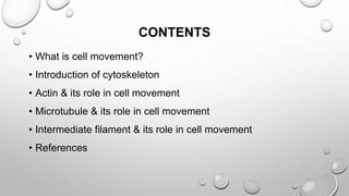 Cell movement is accomplished through the cytoskeleton, which is composed of three main types of fibers: actin filaments, microtubules, and intermediate filaments. Actin filaments interact with motor proteins like myosin to generate movement and play roles in cell adhesion, crawling, and contraction. Microtubules and their motor proteins kinesin and dynein facilitate intracellular transport and movement of cilia and flagella. Intermediate filaments provide structural support to cells but are not involved in motility. The three fiber types work together with associated proteins to control cell shape, division, transport, and movement.