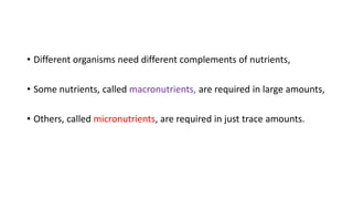 This document discusses cell nutrition and culture media. It notes that different organisms require different nutrients, with macronutrients needed in large amounts and micronutrients in trace amounts. Cells are made up primarily of macromolecules like proteins, nucleic acids, lipids, and polysaccharides. Culture media are used to grow microorganisms and can be defined, containing precise chemicals, or complex, containing digests of microbial, animal, or plant products. Selective and differential media are used to isolate specific microorganisms using indicators and inhibitors. Examples of commonly used media like EMB, MacConkey, MSA, TSI, and CHROM agar are described.