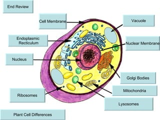 The document describes the main parts of an animal cell including the cell membrane, endoplasmic reticulum, nucleus, ribosomes, Golgi bodies, mitochondria, lysosomes, nuclear membrane, and vacuole. It notes that plant cells contain chloroplasts and a cell wall, which animal cells do not have. The chloroplasts are responsible for photosynthesis by converting sunlight into food using chlorophyll.