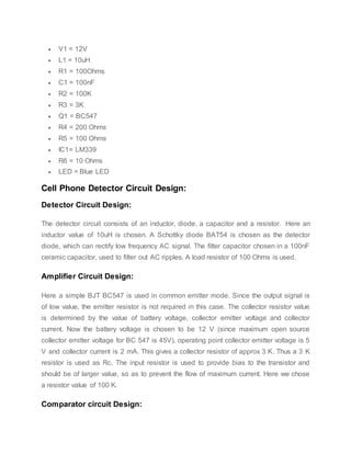 This document describes a circuit to detect the presence of an activated cell phone. The circuit uses a Schottky diode to rectify the radio frequency signals from a cell phone. An inductor placed near the phone receives the signal through induction. The rectified signal is amplified using a transistor and compared to a reference voltage using an LM339 comparator. If the amplified signal is above the reference, the comparator output goes high turning on an LED to indicate the detection of a phone. The circuit can detect phones within centimeters and has applications in examination halls and for detecting stolen or unauthorized phones.