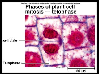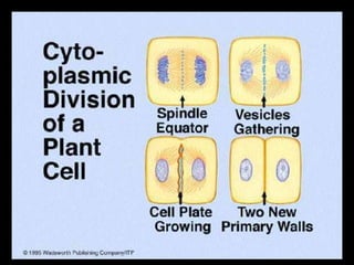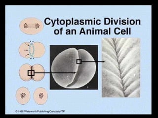 Cell reproduction involves two main processes - mitosis and cytokinesis. Mitosis is the division of the nucleus and results in identical daughter cells. Cytokinesis then divides the cytoplasm and completes the formation of two daughter cells from one parent cell. A key difference between plant and animal cell division is that animal cells use centrioles and constriction to divide the cytoplasm, while plant cells form a cell plate to divide without constriction or centrioles.
