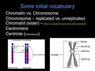![Some initial vocabulary Chromatin vs. Chromosome Chromosome – replicated vs. unreplicated Chromatid (sister) – [ Why is it important that sister chromatids are identical?] Centromere Centriole ( Centrosome )](https://image.slidesharecdn.com/cellreproduction-100504125649-phpapp02/85/Cell-Reproduction-2-320.jpg)