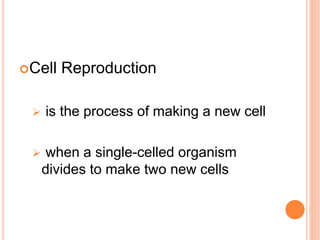 Cell reproduction can occur through asexual or sexual reproduction. Asexual reproduction involves a single parent cell dividing into two daughter cells through processes like budding, cloning, or fission. Sexual reproduction requires the fusion of gametes through fertilization to form a zygote. There are two types of cell division: mitosis and meiosis. Mitosis produces two identical daughter cells from one parent cell through the stages of prophase, metaphase, anaphase and telophase. Meiosis results in gametes or spores with half the number of chromosomes as the parent cell.