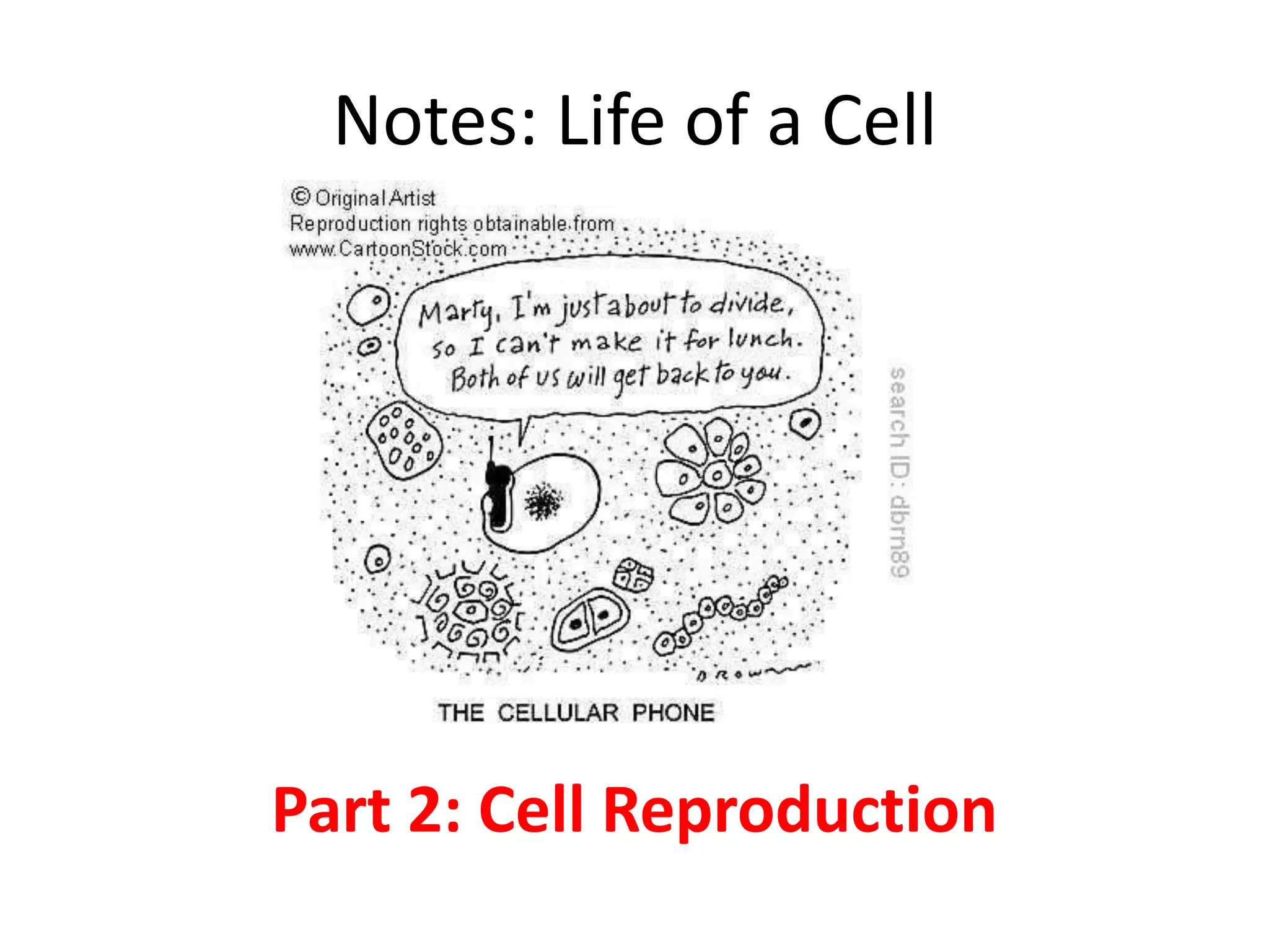 Cell reproduction occurs through cell division which produces daughter cells. There are two types of cell division: asexual and sexual. Asexual division produces two identical daughter cells through mitosis and occurs in both eukaryotic and prokaryotic cells, while sexual division involves meiosis and produces non-identical sperm and egg cells found only in eukaryotes. The cell cycle is the series of events cells undergo before and during cell division, consisting of interphase, mitosis, and cytokinesis phases.