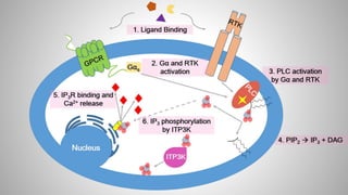 Cell signaling involves communication between cells through signaling molecules called ligands. Ligands bind to receptors on target cells and initiate cellular responses. There are several types of cell signaling depending on the location of the signaling and target cells. These include paracrine signaling between nearby cells, endocrine signaling between distant cells via the bloodstream, and autocrine signaling where cells signal themselves. The signaling molecules can be membrane-bound or secreted. Receptors are generally intracellular or cell surface proteins that receive signals and transmit them into the cell. Common signaling pathways involve G protein-coupled receptors activating intracellular secondary messengers like cyclic AMP.