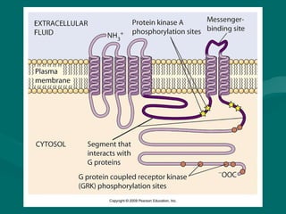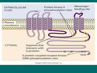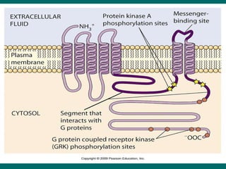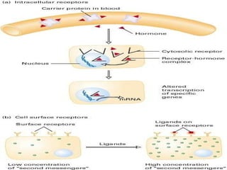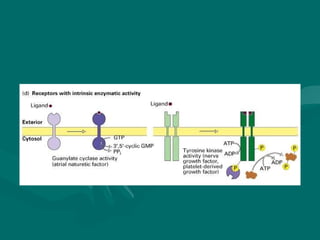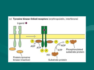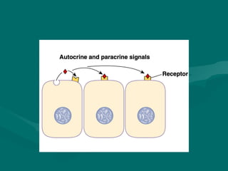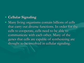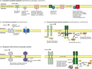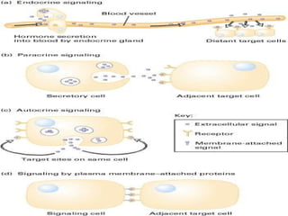 Cell signaling involves communication between cells through extracellular signaling molecules that bind to receptor proteins on the cell surface or inside the cell. These receptors activate intracellular signaling pathways that lead to changes in target proteins and cell behavior. The major types of cellular signaling pathways are those using membrane receptors, including ion channel-linked receptors, enzyme-linked receptors, and G protein-coupled receptors, which activate intracellular signaling proteins upon ligand binding.