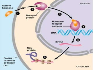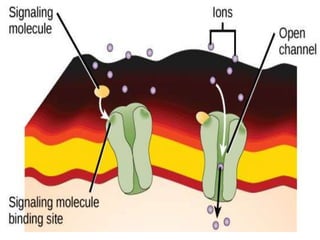 The document discusses cell signaling pathways and regulation. It describes different types of cell signaling including autocrine, paracrine, synaptic, endocrine, and juxtacrine signaling. It also discusses various signaling molecules like hormones, neurotransmitters, growth factors, and cytokines. The different types of cell surface receptors and intracellular receptors are described, including G protein-coupled receptors, enzyme-linked receptors, and ion channel receptors. The mechanisms of various cell signaling pathways such as G protein signaling and MAP kinase pathways are summarized. Disorders related to improper cell signaling are also mentioned.
