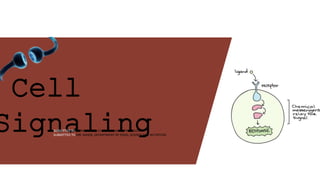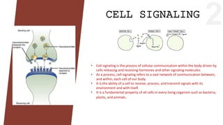 Cell signaling is the process by which cells communicate via hormones and other signaling molecules. It is a fundamental property of all cells that allows cells to receive, process, and transmit signals within their environment and themselves. Cell signaling is responsible for key cellular processes like homeostasis, growth and development, and the production of hormones. Signaling can occur over long or short distances via different pathways and involves signal reception by cellular receptors, signal transduction, and cellular responses. When cell communication breaks down, it can result in disease.
